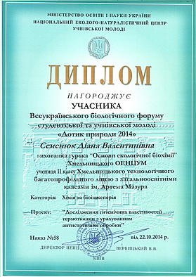 Однак, глибокі знання природничих наук і розуміння тематики індивідуально виконаної проектної роботи, які наша юна дослідниця Діана Семенюк набувала на уроках хімії в ліцеї у Наталії Володимирівни Зими та навчальних теоретичних і практичних заняттях гуртка основ екологічної біохімії ХОЕНЦУМ під керівництвом доцента кафедри хімічної технології Хмельницького національного університету Алли Ярославівни Ганзюк, діючого на базі університету, були переконливими і здобули визнання членів конкурсного журі й були відзначені Дипломом та відповідним Сертифікатом за зайняте ІІ місце на Всеукраїнському Форумі «Дотик природи-2014».